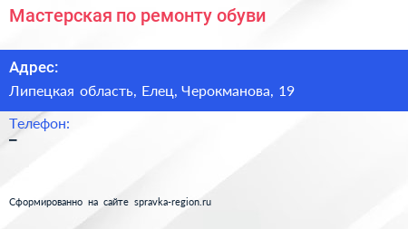 Мастерская по ремонту обуви по адресу Липецкая область, Елец, Черокманова, 19 в дальнейшем Организация, размещена в следующих категориях: