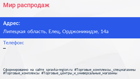 Мир распродаж по адресу Липецкая область, Елец, Орджоникидзе, 14а в дальнейшем Организация, размещена в следующих категориях: