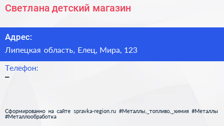 Светлана, детский магазин по адресу Липецкая область, Елец, Мира, 123 в дальнейшем Организация, размещена в следующих категориях: