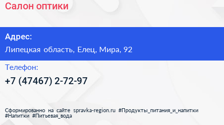 Салон оптики по адресу Липецкая область, Елец, Мира, 92 в дальнейшем Организация, размещена в следующих категориях: