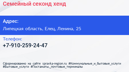 Семейный, секонд-хенд по адресу Липецкая область, Елец, Ленина, 25 в дальнейшем Организация, размещена в следующих категориях: