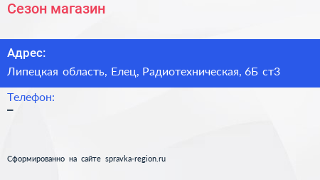 Сезон, магазин по адресу Липецкая область, Елец, Радиотехническая, 6Б ст3 в дальнейшем Организация, размещена в следующих категориях: