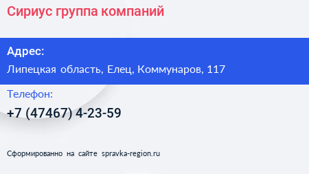 Сириус, группа компаний по адресу Липецкая область, Елец, Коммунаров, 117 в дальнейшем Организация, размещена в следующих категориях: