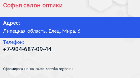 Софья, салон оптики по адресу Липецкая область, Елец, Мира, 6 в дальнейшем Организация, размещена в следующих категориях: