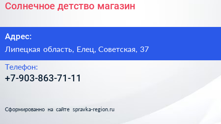 Солнечное детство, магазин по адресу Липецкая область, Елец, Советская, 37 в дальнейшем Организация, размещена в следующих категориях: