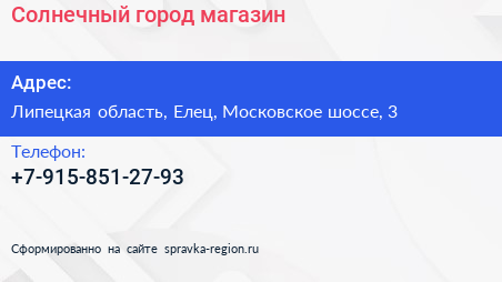 Солнечный город, магазин по адресу Липецкая область, Елец, Московское шоссе, 3 в дальнейшем Организация, размещена в следующих категориях: