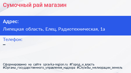 Сумочный рай, магазин по адресу Липецкая область, Елец, Радиотехническая, 1а в дальнейшем Организация, размещена в следующих категориях: