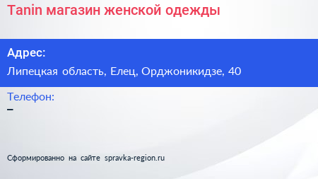 Tanin, магазин женской одежды по адресу Липецкая область, Елец, Орджоникидзе, 40 в дальнейшем Организация, размещена в следующих категориях:
