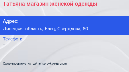 Татьяна, магазин женской одежды по адресу Липецкая область, Елец, Свердлова, 80 в дальнейшем Организация, размещена в следующих категориях: