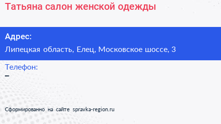 Татьяна, салон женской одежды по адресу Липецкая область, Елец, Московское шоссе, 3 в дальнейшем Организация, размещена в следующих категориях: