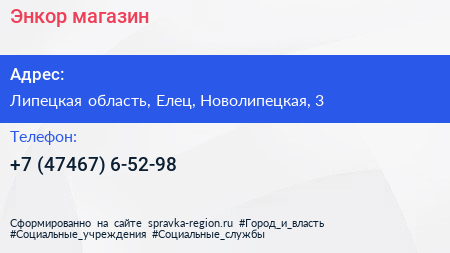 Энкор, магазин по адресу Липецкая область, Елец, Новолипецкая, 3 в дальнейшем Организация, размещена в следующих категориях: