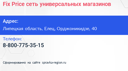 Fix Price, сеть универсальных магазинов по адресу Липецкая область, Елец, Орджоникидзе, 40 в дальнейшем Организация, размещена в следующих категориях:
