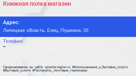 Книжная полка, магазин по адресу Липецкая область, Елец, Пушкина, 35 в дальнейшем Организация, размещена в следующих категориях:
