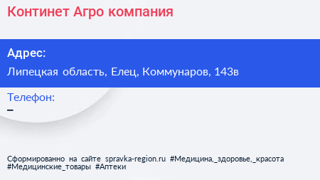 Континет Агро, компания по адресу Липецкая область, Елец, Коммунаров, 143в в дальнейшем Организация, размещена в следующих категориях: