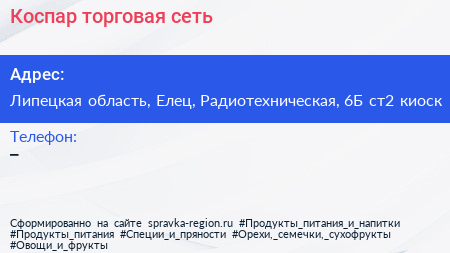 Коспар, торговая сеть по адресу Липецкая область, Елец, Радиотехническая, 6Б ст2 киоск в дальнейшем Организация, размещена в следующих категориях: