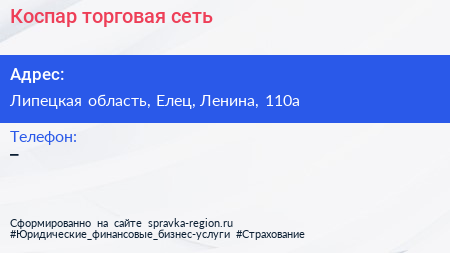 Коспар, торговая сеть по адресу Липецкая область, Елец, Ленина, 110а в дальнейшем Организация, размещена в следующих категориях: