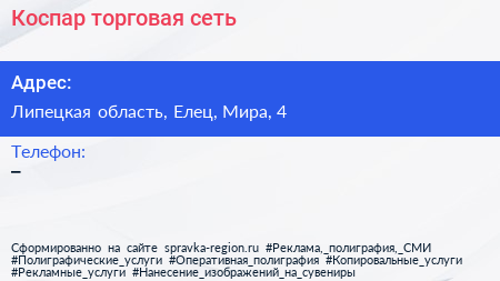 Коспар, торговая сеть по адресу Липецкая область, Елец, Мира, 4 в дальнейшем Организация, размещена в следующих категориях: