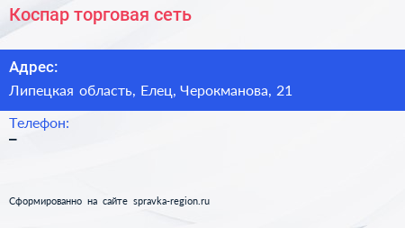 Коспар, торговая сеть по адресу Липецкая область, Елец, Черокманова, 21 в дальнейшем Организация, размещена в следующих категориях: