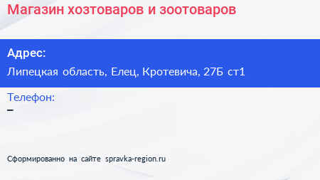 Магазин хозтоваров и зоотоваров по адресу Липецкая область, Елец, Кротевича, 27Б ст1 в дальнейшем Организация, размещена в следующих категориях:
