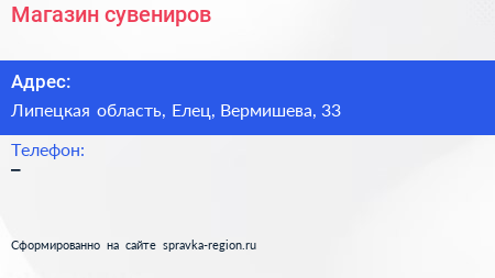 Магазин сувениров по адресу Липецкая область, Елец, Вермишева, 33 в дальнейшем Организация, размещена в следующих категориях: