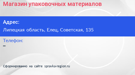 Магазин упаковочных материалов по адресу Липецкая область, Елец, Советская, 135 в дальнейшем Организация, размещена в следующих категориях: