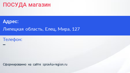 ПОСУДА, магазин по адресу Липецкая область, Елец, Мира, 127 в дальнейшем Организация, размещена в следующих категориях: