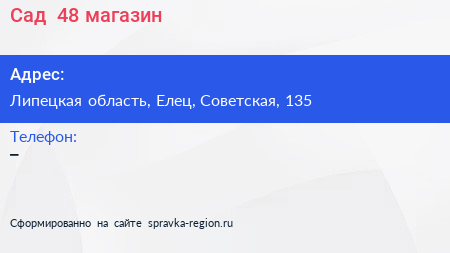 Сад +48, магазин по адресу Липецкая область, Елец, Советская, 135 в дальнейшем Организация, размещена в следующих категориях: