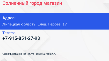 Солнечный город, магазин по адресу Липецкая область, Елец, Героев, 17 в дальнейшем Организация, размещена в следующих категориях:
