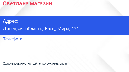 Светлана, магазин по адресу Липецкая область, Елец, Мира, 121 в дальнейшем Организация, размещена в следующих категориях:
