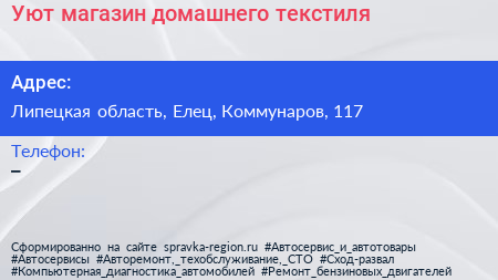 Уют, магазин домашнего текстиля по адресу Липецкая область, Елец, Коммунаров, 117 в дальнейшем Организация, размещена в следующих категориях: