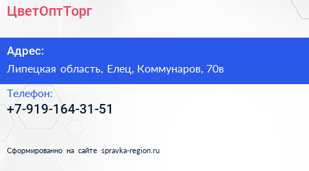 ЦветОптТорг по адресу Липецкая область, Елец, Коммунаров, 70в в дальнейшем Организация, размещена в следующих категориях: