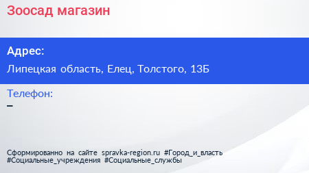 Зоосад, магазин по адресу Липецкая область, Елец, Толстого, 13Б в дальнейшем Организация, размещена в следующих категориях: