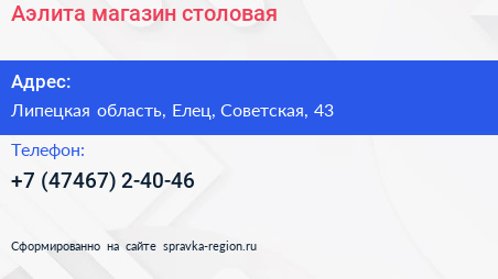 Аэлита, магазин-столовая по адресу Липецкая область, Елец, Советская, 43 в дальнейшем Организация, размещена в следующих категориях:
