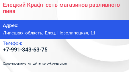 Елецкий Крафт, сеть магазинов разливного пива по адресу Липецкая область, Елец, Новолипецкая, 11 в дальнейшем Организация, размещена в следующих категориях: