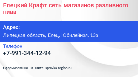 Елецкий Крафт, сеть магазинов разливного пива по адресу Липецкая область, Елец, Юбилейная, 13а в дальнейшем Организация, размещена в следующих категориях: