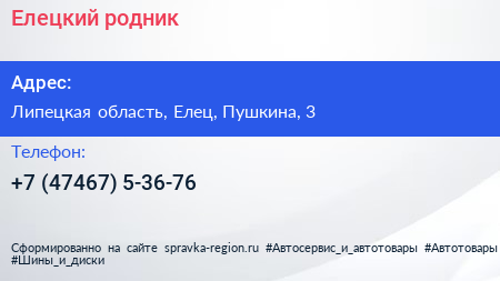 Елецкий родник по адресу Липецкая область, Елец, Пушкина, 3 в дальнейшем Организация, размещена в следующих категориях: