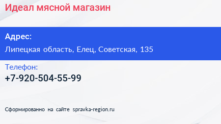 Идеал, мясной магазин по адресу Липецкая область, Елец, Советская, 135 в дальнейшем Организация, размещена в следующих категориях: