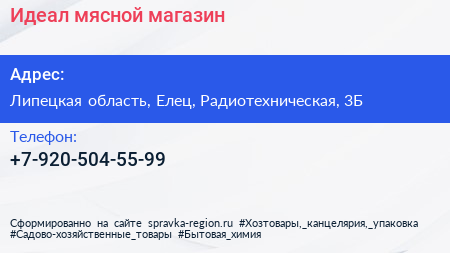 Идеал, мясной магазин по адресу Липецкая область, Елец, Радиотехническая, 3Б в дальнейшем Организация, размещена в следующих категориях: