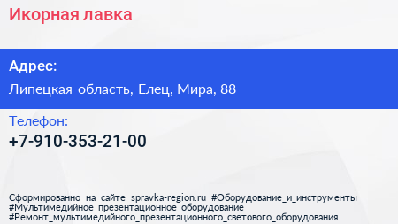 Икорная лавка по адресу Липецкая область, Елец, Мира, 88 в дальнейшем Организация, размещена в следующих категориях: