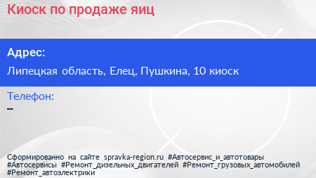 Киоск по продаже яиц по адресу Липецкая область, Елец, Пушкина, 10 киоск в дальнейшем Организация, размещена в следующих категориях: