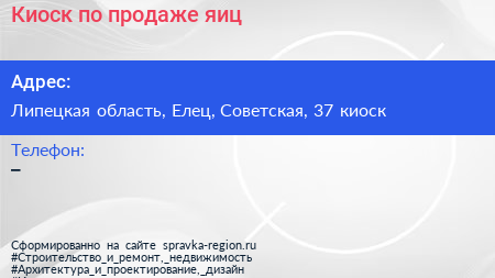 Киоск по продаже яиц по адресу Липецкая область, Елец, Советская, 37 киоск в дальнейшем Организация, размещена в следующих категориях: