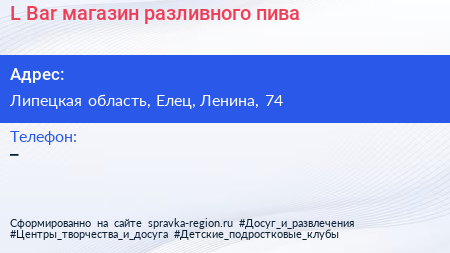 L`Bar, магазин разливного пива по адресу Липецкая область, Елец, Ленина, 74 в дальнейшем Организация, размещена в следующих категориях:
