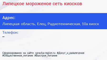 Липецкое мороженое, сеть киосков по адресу Липецкая область, Елец, Радиотехническая, 10а киоск в дальнейшем Организация, размещена в следующих категориях: