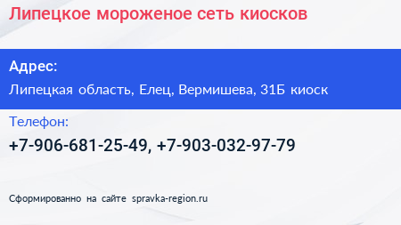 Липецкое мороженое, сеть киосков по адресу Липецкая область, Елец, Вермишева, 31Б киоск в дальнейшем Организация, размещена в следующих категориях: