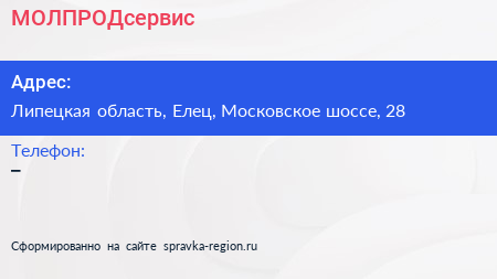 МОЛПРОДсервис по адресу Липецкая область, Елец, Московское шоссе, 28 в дальнейшем Организация, размещена в следующих категориях: