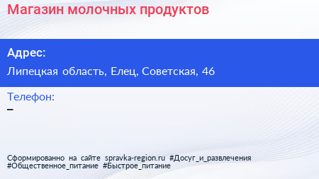 Магазин молочных продуктов по адресу Липецкая область, Елец, Советская, 46 в дальнейшем Организация, размещена в следующих категориях: