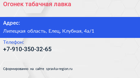 Огонек, табачная лавка по адресу Липецкая область, Елец, Клубная, 4а/1 в дальнейшем Организация, размещена в следующих категориях: