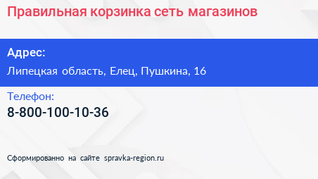Правильная корзинка, сеть магазинов по адресу Липецкая область, Елец, Пушкина, 16 в дальнейшем Организация, размещена в следующих категориях:
