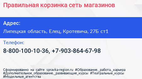 Правильная корзинка, сеть магазинов по адресу Липецкая область, Елец, Кротевича, 27Б ст1 в дальнейшем Организация, размещена в следующих категориях:
