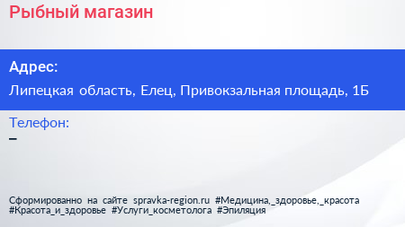 Рыбный магазин по адресу Липецкая область, Елец, Привокзальная площадь, 1Б в дальнейшем Организация, размещена в следующих категориях: